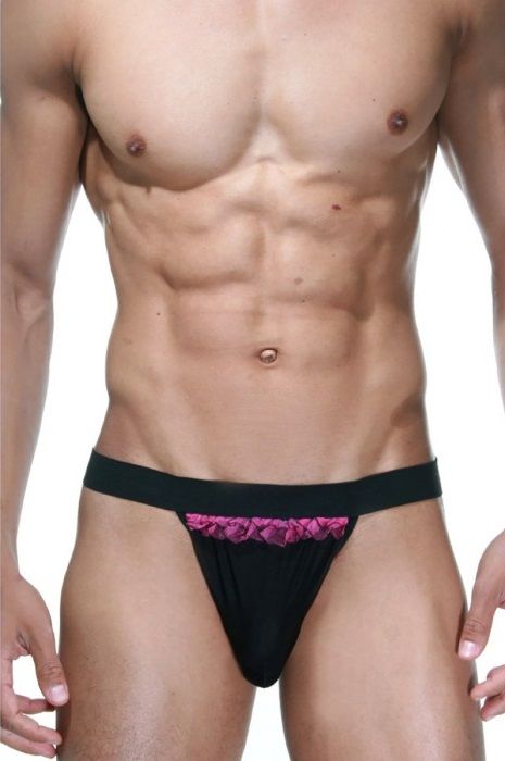 Черные трусы-танга для мужчин с низкой посадкой, на широкой резинке. Спереди розовая небольшая рюша.