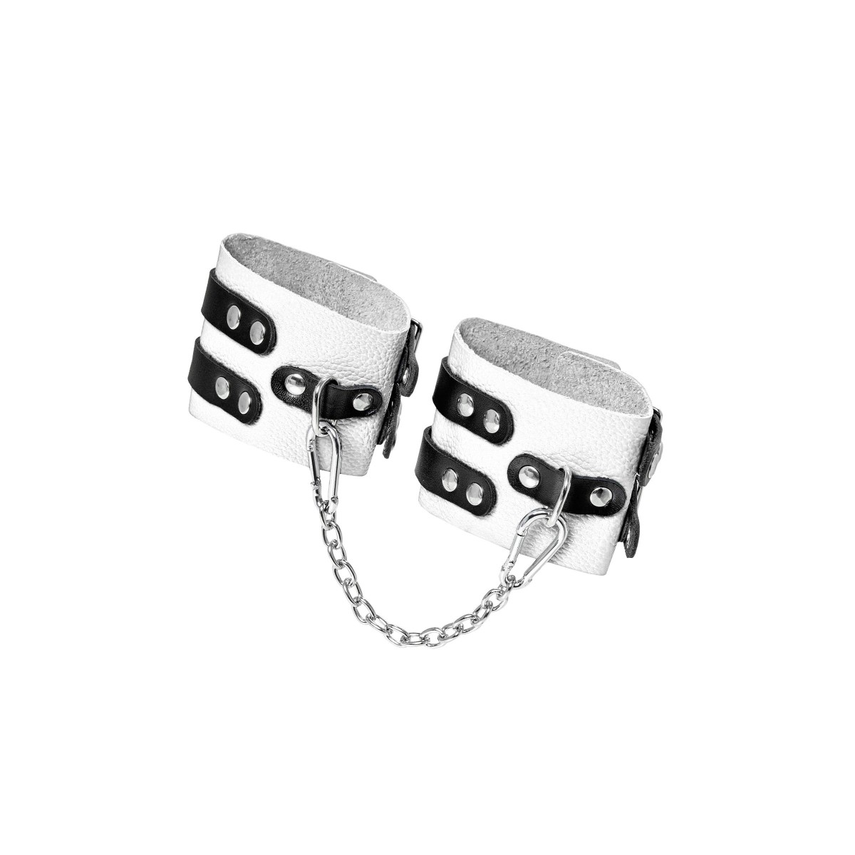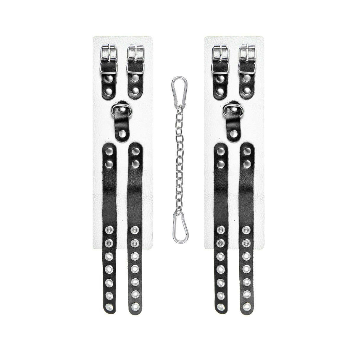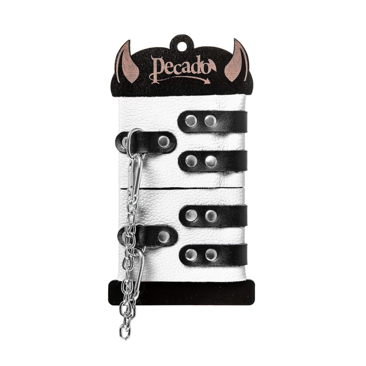 Мягкие оковы с двумя жёсткими ремешками от Pecado помогут обездвижить партнера во время сексуальных прелюдий или жестких БДСМ-играх. Оковы изготовлены полностью из белой, натуральной кожи. Ремешки выполнены из чёрной жёсткой кожи, украшены люверсами. Выделка материала произведена вручную. Ремешки и широкая манжета хорошо держат форму: не тянутся и не мнутся. Качественная металлическая фурнитура добавляет лоска изделию, а аромат натуральной кожи повышает градус возбуждения. Благодаря широкому запасу регулировок, можно подобрать необходимый обхват. Аксессуар удобно застегивать и легко расстегивать. При правильном использовании не оставляет следов на теле и не доставляет дискомфорта. Манжеты оков соединяются между собой помощью двух карабинов и съемной стальной цепочки. Подходит и для женских, и для мужских ног. Длина манжет - 25 см, ширина - 7 см. Длина сцепки - 20 см.