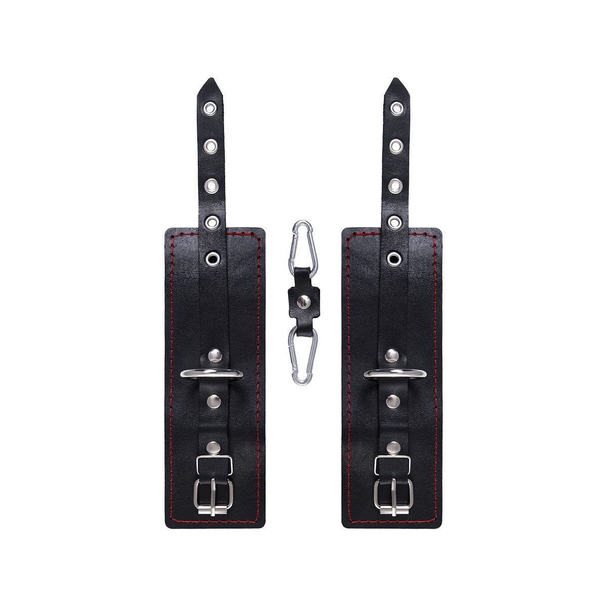 Однослойные кожаные наручники с контрастной строчкой красного цвета могут стать стильным аксессуаром на «свободных» руках, но могут послужить вашим целям и фантазиям по своему прямому назначению. Наличие двух карабинов и колец позволяет использовать изделие как раздельно – аксессуар-манжеты, так и как наручники для фиксации. К широким металлическим кольцам также можно присоединить и другие аксессуары при помощи карабинов. Благодаря универсальному размеру наручники могут использоваться и мужчинами, и женщинами. Размер легко регулируется с помощью металлических пряжек, органично вписывающихся в общий стиль. Длина манжет - 20 см, ширина - 6,5 см. Длина сцепки - 11 см.