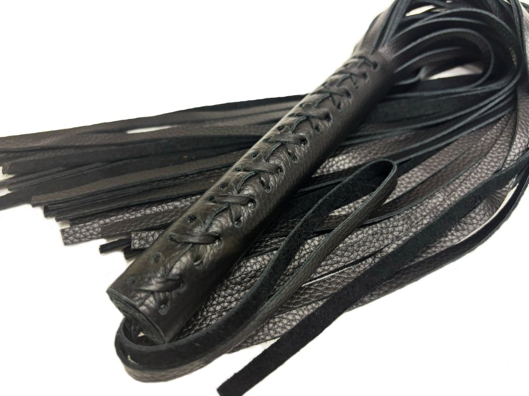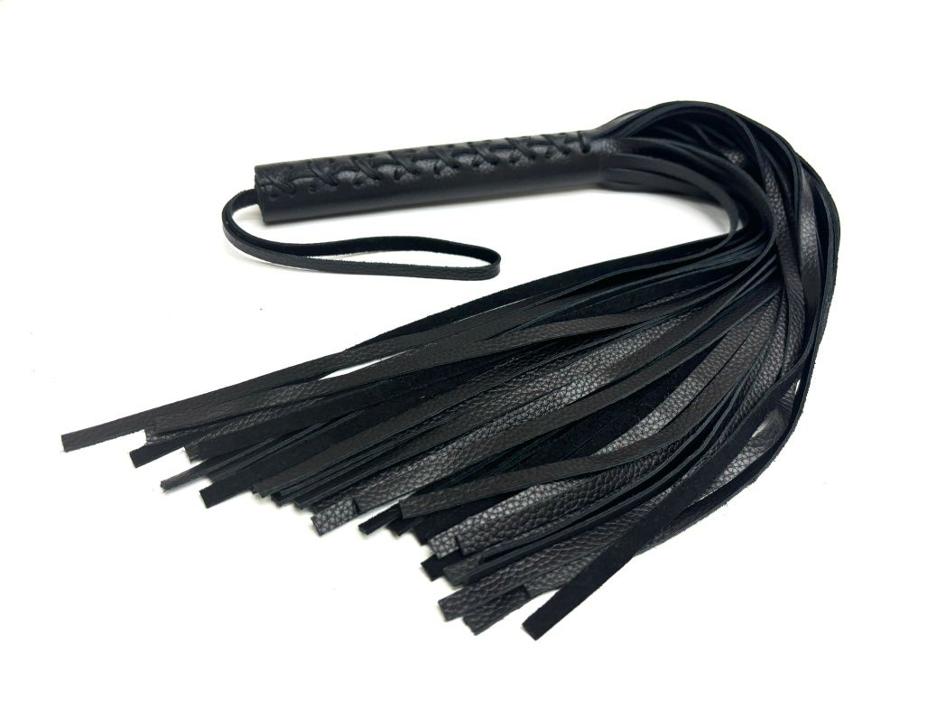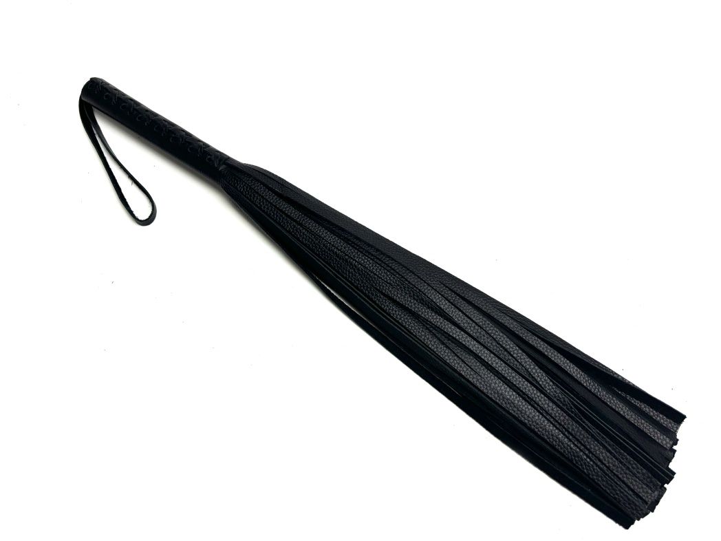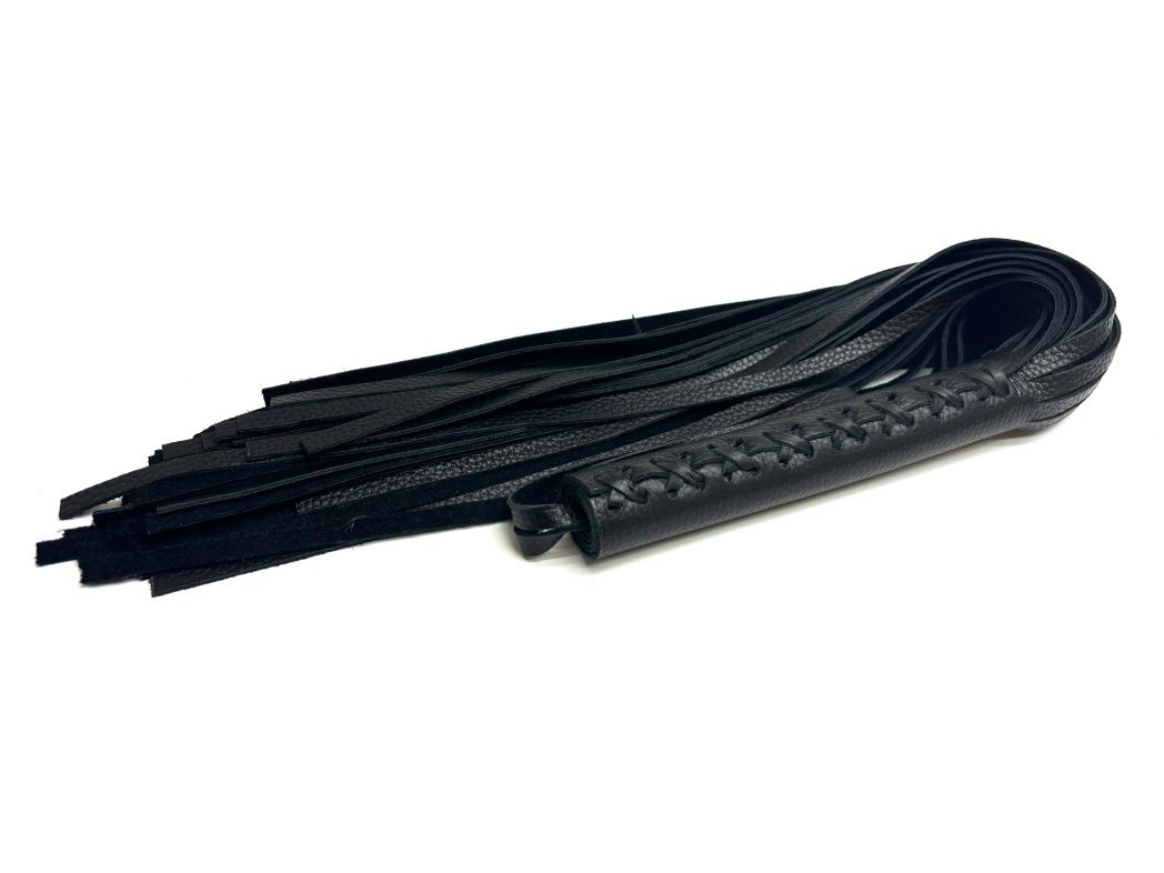 Эта плеть - уникальная модель, выполненная из цельного куска нежной зернистой натуральной кожи высокого качества в классическом черном цвете. Плеть очень пышная и богатая, в ней 50 хвостов! На рукоятке находится плетение, что придает особый шарм. Благодаря своей цельной конструкции, данная плеть прослужит Вам долго, хвосты не оторвутся и сохранят свой благородный вид, аксессуар очень надежный и красивый. Для удобства на рукоятке имеется кожаная петелька. Длина хвостов - 40 см.