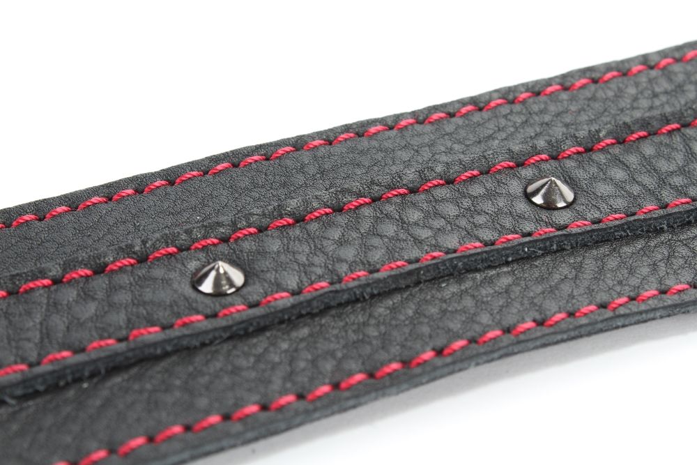 Черный кожаный ошейник с красной оторочкой. Декорирован небольшими шипами в передней части изделия. Имеет D-кольцо для карабина. Имеет 7 отверстий для регулировки размера. Ширина - 5 см.