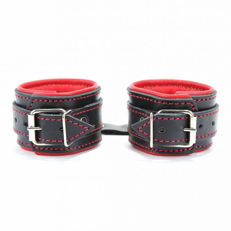 Оковы на ноги с красным подкладом. Выполнены из толстой ременной кожи черного цвета, подклад мягкая перчаточная кожа ярко красного цвета. На пряжке. Использована усиленная металлическая фурнитура. Строчка толстой ниткой контрастного красного цвета.
