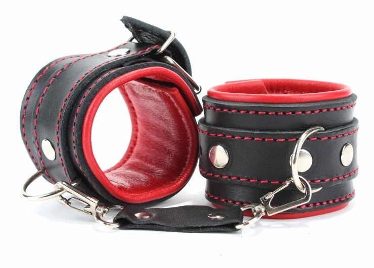 Оковы на руки с красным подкладом. Выполнены из толстой ременной кожи черного цвета, подклад мягкая перчаточная кожа ярко красного цвета. На пряжке. Использована усиленная металлическая фурнитура. Строчка толстой ниткой контрастного красного цвета.