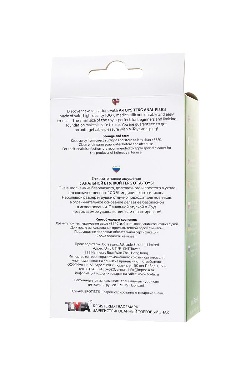 Откройте новые ощущения с анальной втулкой Terg от A-Toys! Она выполнена из безопасного, долговечного и простого в уходе высококачественного 100 % медицинского силикона. Небольшой размер игрушки отлично подходит для новичков, а ограничительное основание делает ее безопасной в использовании. С анальной втулкой A-Toys незабываемое удовольствие вам гарантировано! Рабочая длина - 8,5 см. Минимальный диаметр - 1,5 см.