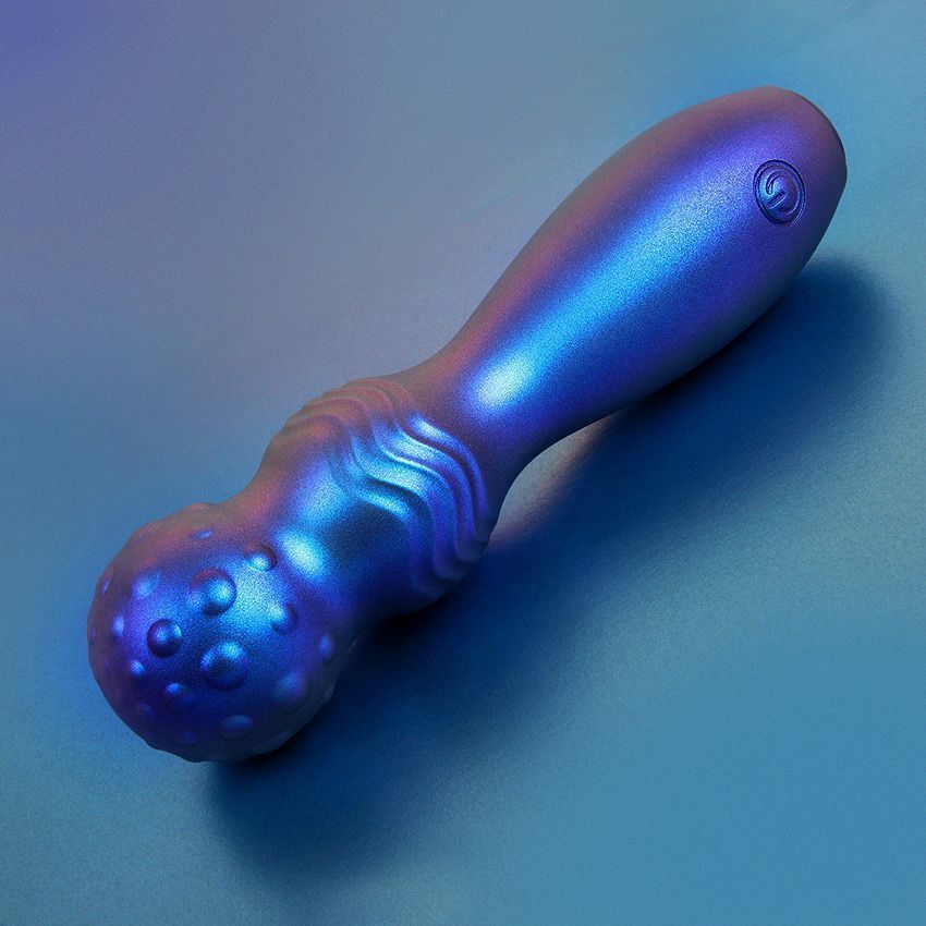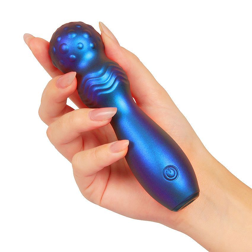 Синий фигурный вибромассажер с шаровидной головкой. 10 режимов вибрации. Перезаряжаемый.